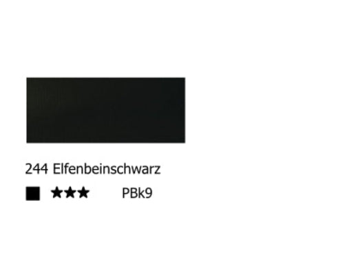 Wissenswertes | Ein stabiles, vielseitig einsetzbares Einzelpigment-Schwarz mit braunen Untertönen und ausgezeichneter Tönungskraft. Der Name stammt von der traditionellen Methode zur Gewinnung des Pigments: dem Rösten von Elfenbein. Dies war eine beliebte Farbe vieler alter Meister, einschließlich Rembrandt. |