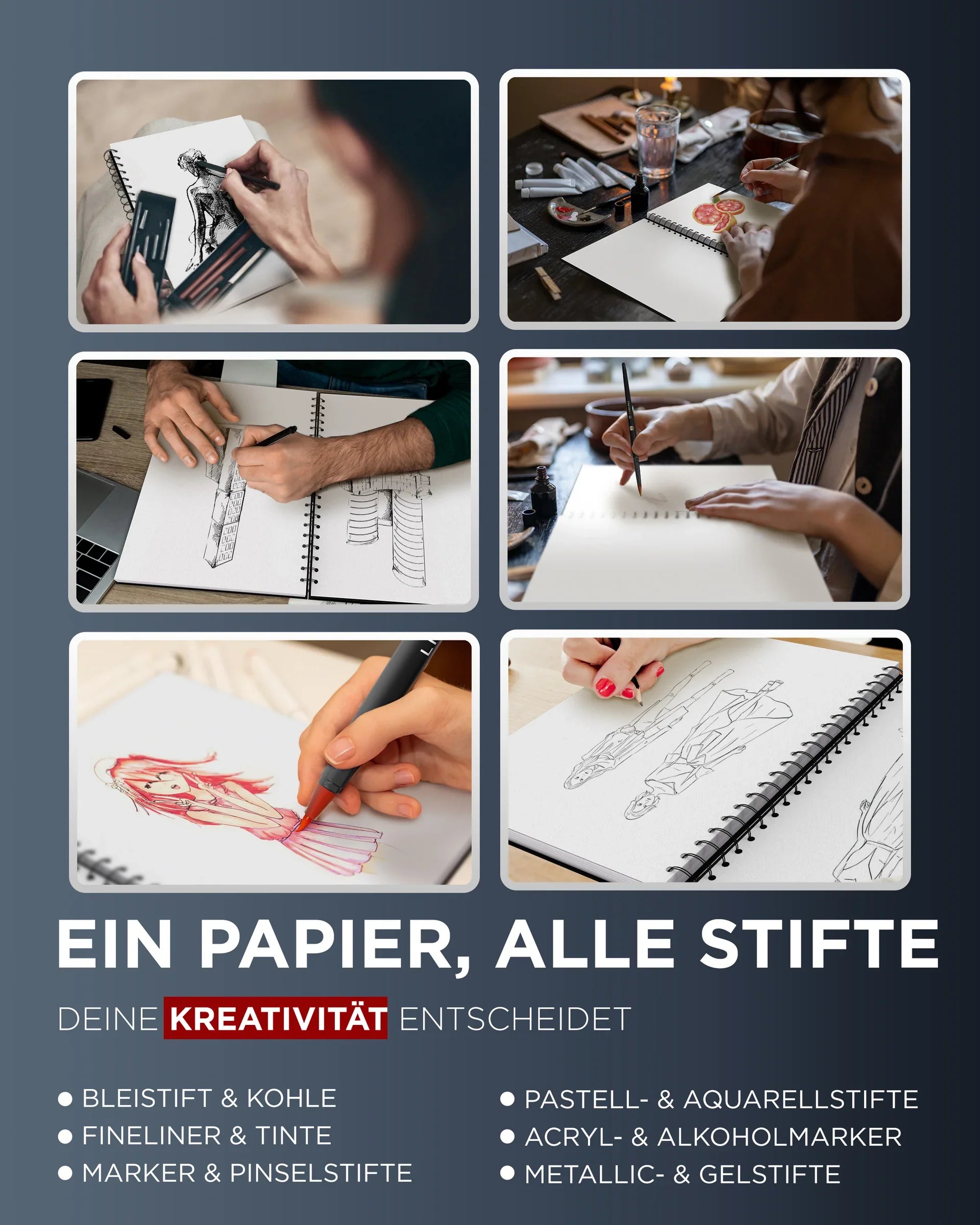 - GRATIS E-BOOK – Du bekommst ein kostenfreies E-Book dazu – mit Tipps, Übungen und Inspiration für mehr Tiefe, Technik und Freude beim Zeichnen. Für Einsteiger und Fortgeschrittene geeignet.