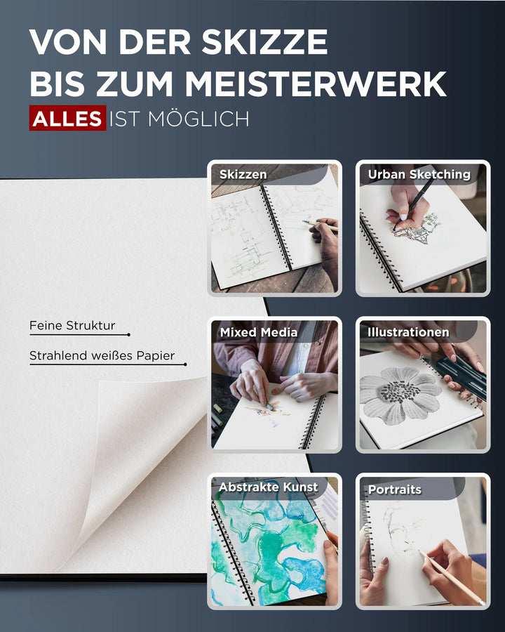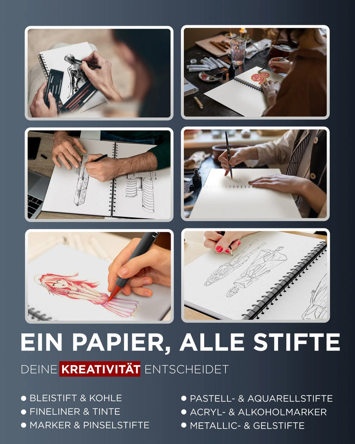- FÜR ALLE MALTECHNIKEN – Nutze Bleistifte, Marker, Tinte, Kohle, Buntstifte oder Aquarellfarben – unser Papier hält alles aus. Kein Durchfärben, kein Auslaufen, maximaler kreativer Freiraum.