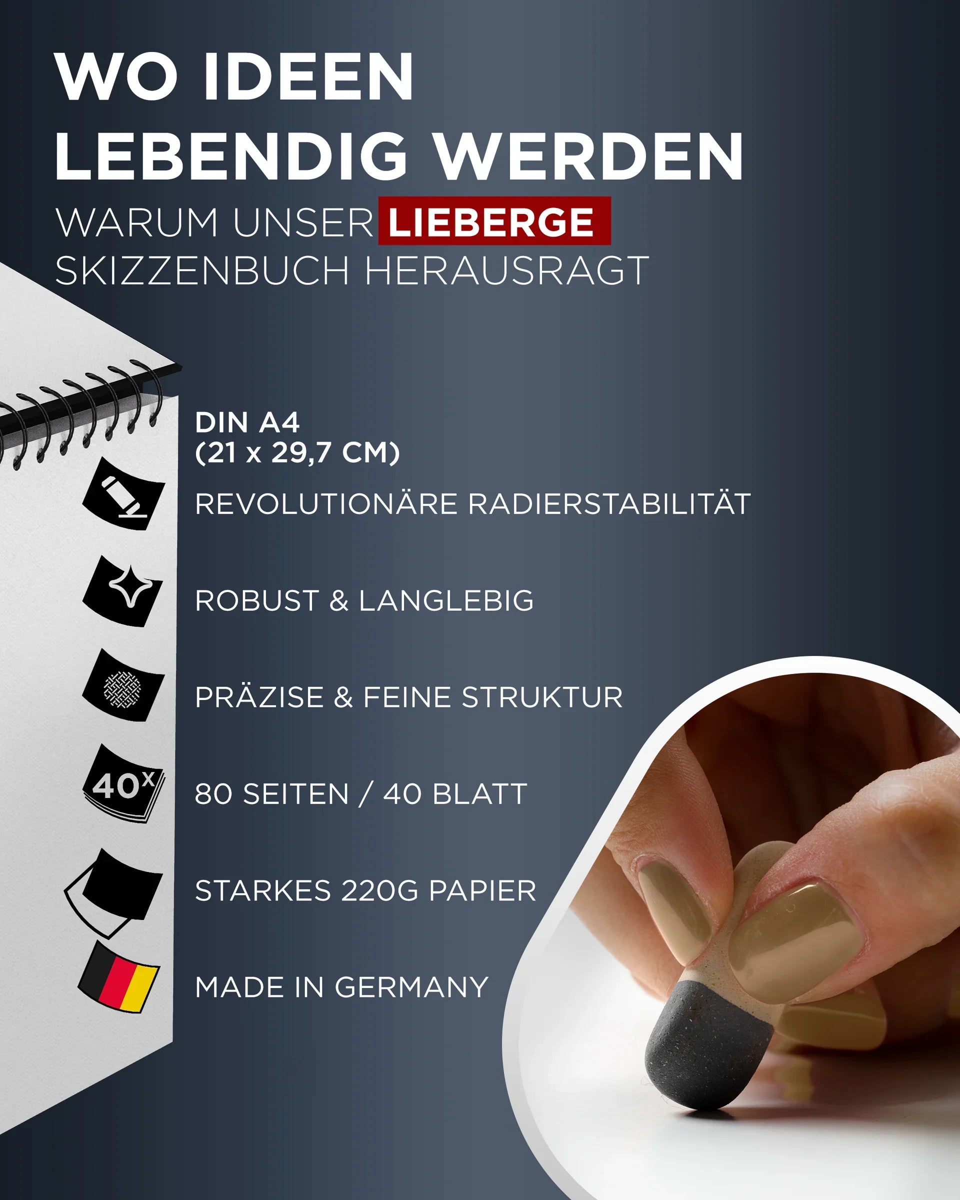 - RADIERFEST – Korrigiere so oft Du willst! Unser 220 g starkes, reinweißes Premium-Papier bleibt auch nach mehrfachem Radieren glatt und widerstandsfähig, ohne sich abzunutzen.