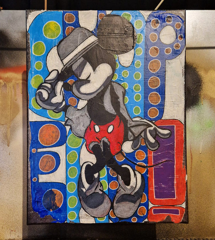Dieses Mixed Media Gemälde auf Leinwand kombiniert verspielte Comic-Ästhetik mit urbanem Streetart-Charme – und das in strahlenden Farben und starken Kontrasten. Der ikonische Charakter in cooler Pose sorgt garantiert für Aufmerksamkeit!