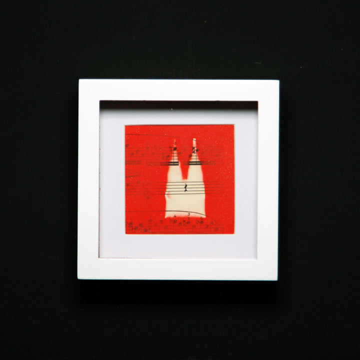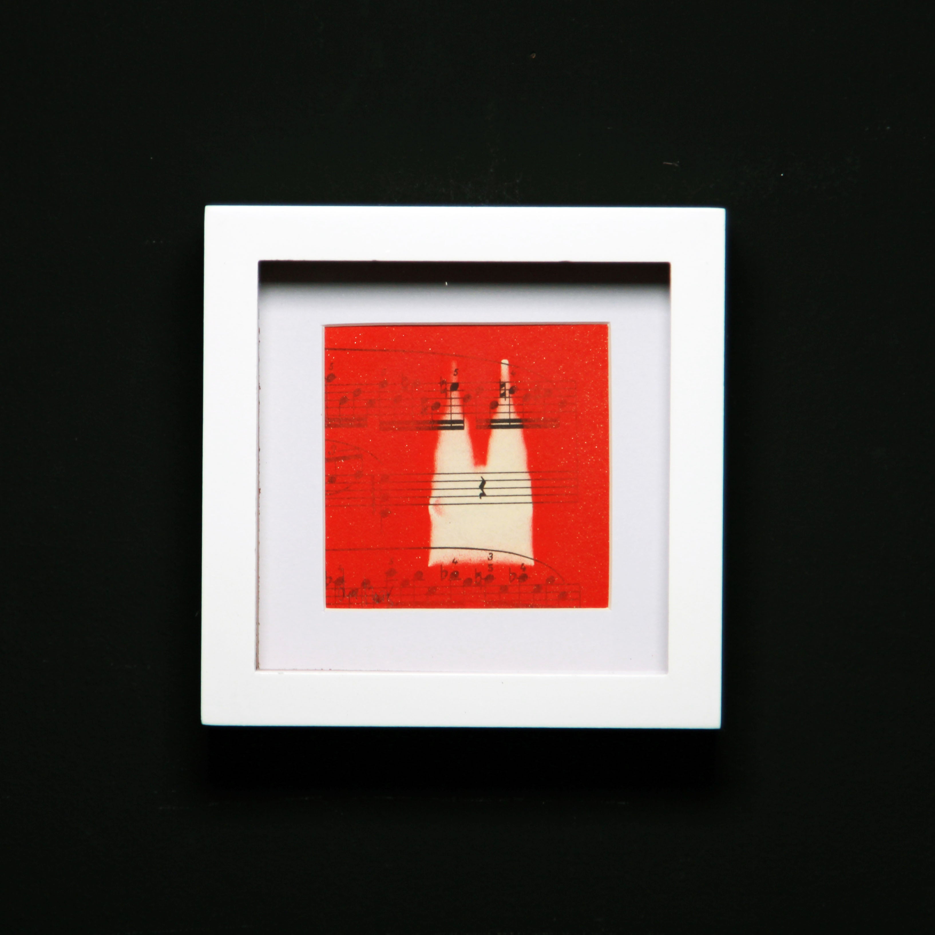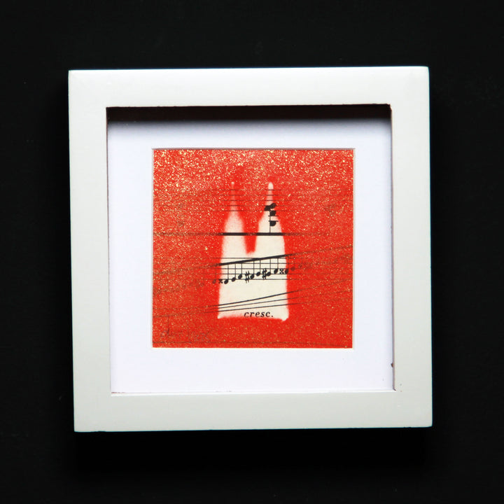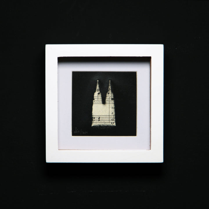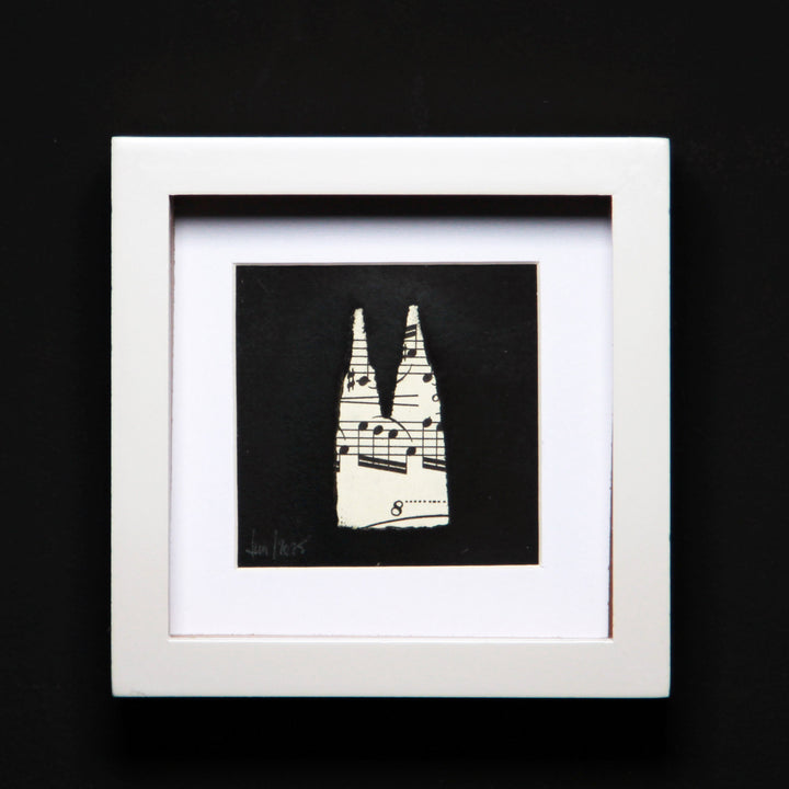 Durch die Kombination von Sprühlack und Papier entsteht ein modernes Kunstwerk mit nostalgischem Flair. Die Noten geben dem Werk eine musikalische Seele. Das Kölner Dom Kunstwerk wird im weißen Rahmen geliefert. Es ist sofort zum Aufhängen bereit.