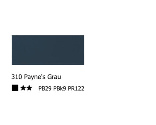 Wissenswertes | Ein dunkles Blaugrau, hergestellt aus einer Mischung aus Ultramarin, Mars Schwarz und manchmal Karmin. Es wurde nach dem Aquarellisten des 18. Jahrhunderts William Payne benannt, der die Mischung erstellt und sie oft seinen Schülern als Alternative zu reinem Schwarz empfohlen hat. |